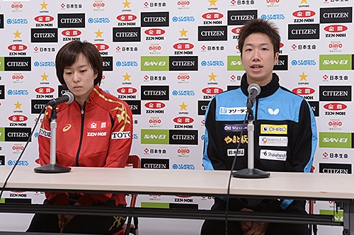 記者会見で今大会への意気込みを語った水谷(右)、石川