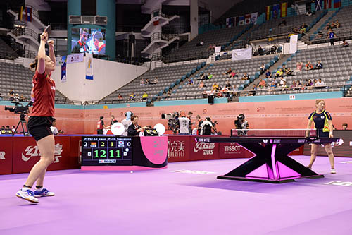 韓国対ドイツの一戦は昨日、日本に勝利して勢いに乗るドイツが躍動。1番のヴィンターが徐孝元に2対0から追いつかれたものの、最終ゲームは1-5から怒濤の巻き返しを見せ、11-6で勝利。威力抜群のフォアハンドで徐孝元のカットを打ち破った。2番のP.ゾルヤはバックハンドを主体にしたプレーで梁夏銀を圧倒。緩急をつけたプレーが光りストレート勝ちを収めた。3番のイバンカンはカット主戦型ながら隙あらば攻撃を仕掛けるスタイルで、朴英淑をリード。2対1とリードで迎えた第4ゲームはシーソーゲームとなったが、競り合いを制してドイツの準々決勝進出を決めた。