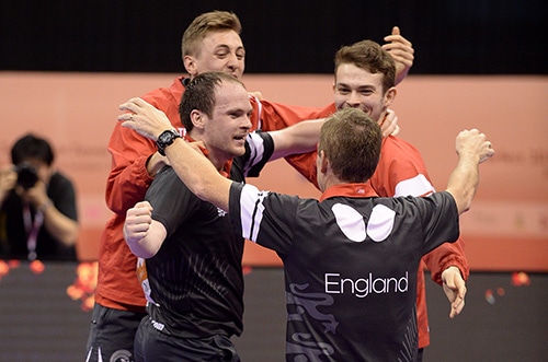イングランド対フランスの一戦は最後までもつれる熱い戦いとなった。1、2番は両チームが1点ずつ取り合い、3番ではフロールが勝利してフランスがベスト4進出に王手をかけた。しかし、イングランドは4番のピッチフォードがS.ゴズィーに勝利。各ゲームともに接戦となり、好ラリーが続出した試合だったが、重要な局面でことごとく得点を挙げたピッチフォードが上回った。迎えた5番はドリンコールとルベッソンの戦いとなった。第3ゲームを終えて2対1とルベッソンがリードしたが、ドリンコールが第4ゲームを奪うと、最終ゲームも10-6とリードしてマッチポイントをつかんだ。しかし、ここから弱気になったかドリンコールがあと一点を奪うことができず10-10になりジュースに突入。続くプレーでもルベッソンが得点を挙げ、マッチポイントを奪われたドリンコール。絶体絶命のピンチだったが、ここから再び反撃。打ち合いでひけを取らずに追いつくと、3連続得点を挙げて13-11で勝利。劇的な形で勝利を収めたドリンコールが喜びを爆発させると、チームメートもドリンコールのもとにかけより全員で勝利を喜んだ。1983年東京大会以来33年ぶりのメダル獲得を決めたイングランドは準決勝で日本と対戦する。