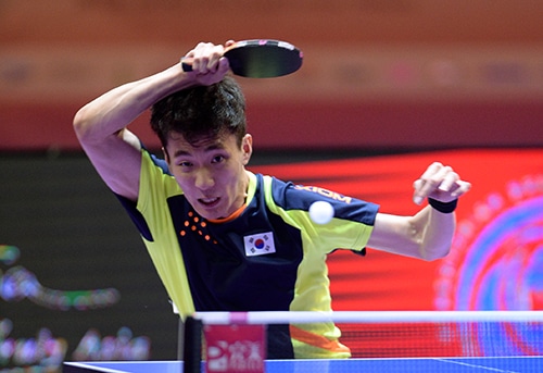 8連覇を目指す中国は韓国と対戦。1番は許昕対李尚洙の一戦。第1ゲームは序盤で許昕がリードするも、自身のサービスの展開から李尚洙が追いつき一進一退の攻防となった。最後は8-8から3連続得点を挙げた李尚洙。フォア前への厳しいストップからチャンスをつくって許昕のミドルを攻め込むなど、積極的なプレーが光り第1ゲームを奪った。