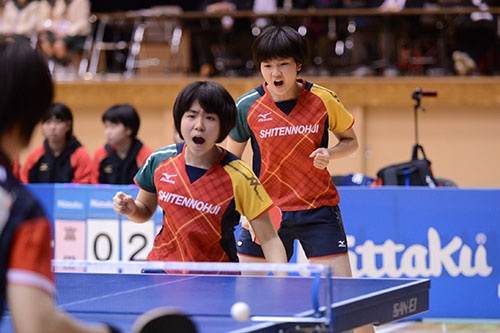 決勝はトップで三條が熊中に敗れるスタートとなったが、ワールドツアークウェートオープンで足首を負傷した橋本が2番で苦しみながらも三村を破り1対1に。お互いに取りたいダブルスは橋本/梅村のカット主戦型と左異質攻守型の変則ペアがコースをうまく突いた攻撃で1対2から逆転勝ちを収め、四天王寺が優勝に王手。4番は堅実な攻守で梅村が小脇をストレートで下し、四天王寺の優勝を決めた。