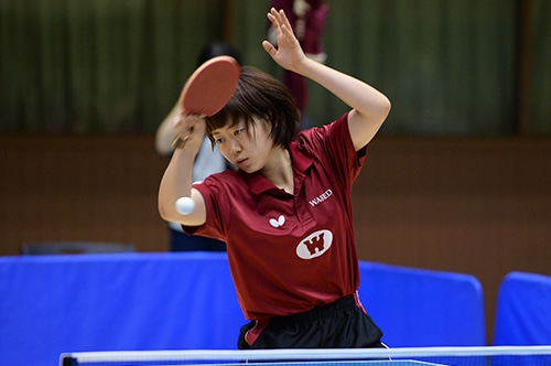 決勝戦はトップで阿部と温馨が対戦。裏面打法を駆使する温に対して、変化の効いたバックハンド攻撃と的確なフォアハンドスマッシュで攻めきった阿部が勝利し、早稲田大学が先制。2番は鎌田と谷岡の対戦。カット打ちが得意の鎌田に谷岡は切れたカットと攻撃の連係で対抗。拮抗した試合はわずかに鎌田が上回り勝利。早稲田大学が王手をかける。