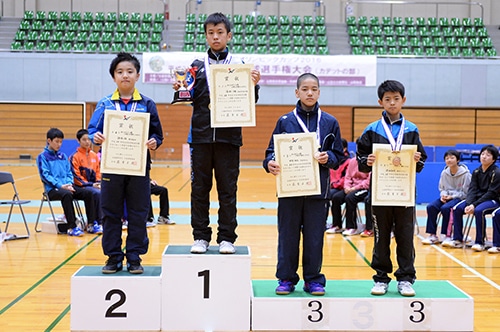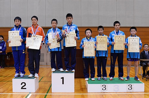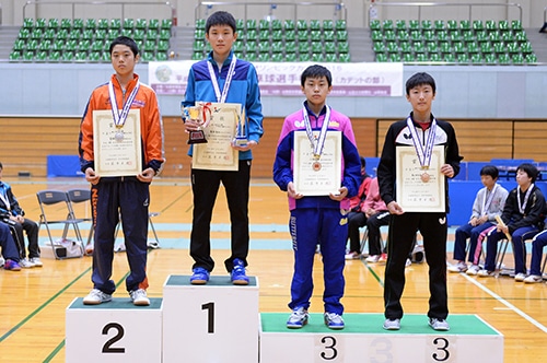 13歳以下男子シングルスは濱田(高知大学附属中学校)が強気の連続攻撃を展開し優勝をつかんだ。「今回は足を使ってフォアハンドで動き切れたことが良かったです」と濱田。苦しい場面も何度もあったが諦めない粘りのプレーが逆転勝利を呼び込んだ。2位には鈴木(鈴木卓球)、3位は田原(明豊中)、徳田(伊予つばさJr)が入った。