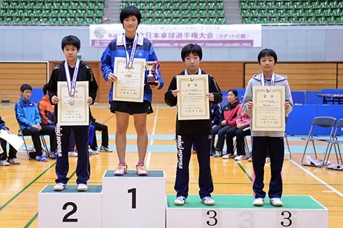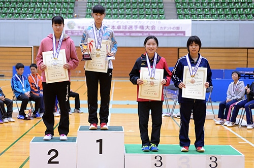 14歳以下女子シングルスは長﨑(JOCエリートアカデミー)が全中に続きカデットも制した。決勝は全中の準決勝でも対戦したカットの相馬(新発田ジュニア)。粘り強くつなぎチャンスボールを見逃さず決めた。「去年はベスト16で敗れて悔しかったので今年は絶対優勝するという強い気持ちで臨みました」と長﨑。 2位は相馬、3位は本井(YHGアスリートクラブ)、門阪(浜松修学舎中)が入った。