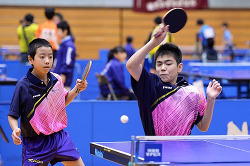 男子ダブルスは愛工大附属中がベスト4を独占。その中で横谷・篠塚が息のあった連続攻撃を見せて優勝を決めた。