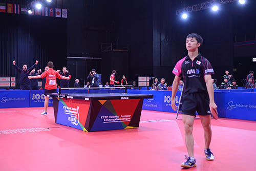 ラストは負けられない張本がラブオールから声を挙げて気迫のこもったプレーを見せ、強烈なバックハンドで先手を取ってストレート勝ちを収め、日本の勝利を決めた。