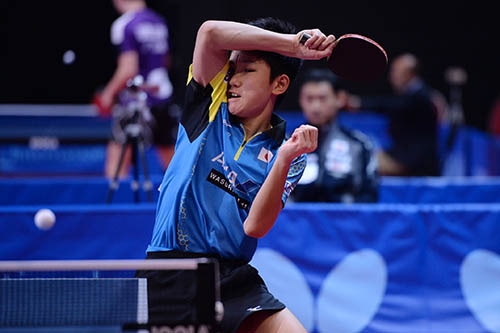第1シードの張本は、両ハンドの強いピエラルトに反撃を受ける場面もあったが、要所で精度の高いフォアハンドで攻めて4対2。