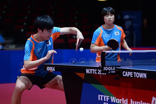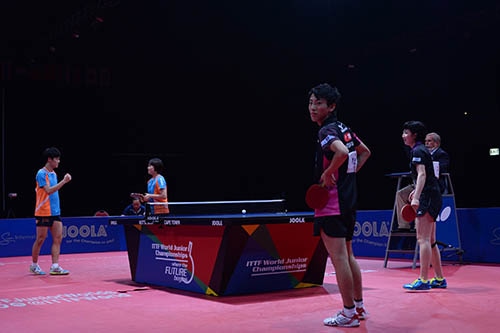 第1ゲームは先手を取って攻めた日本ペアが取ったが、第2、3ゲームは趙勝敏のレシーブ、両ハンド攻撃に押されて、韓国ペアが2ゲーム連取。しかし、続く2ゲームは日本ペアの連係がよく、無理せず攻めて3対2に。優勝に大手がかかって固くなったか、日本ペアにミスが出て第6ゲームを落とし、3対3に。