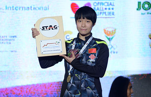 序盤から石洵瑶のパワーに圧倒された麦子詠の得意の前陣両ハンドにもミスが出て石洵瑶が先制。気を取り直した麦子詠は、粘り強く石洵瑶のバック側にボールを集めるなどして、食い下がり第2ゲームを落とすも10-12と互角の展開に。しかし、続く第3ゲームも石洵瑶がジュースで制すると、麦子詠は集中力が切れたか、ミスが増え始め、石洵瑶はパワーボールをワイドに決めて優勝を決めた。