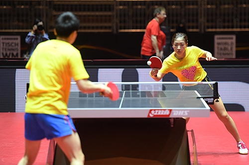 開幕を明日に控えた世界卓球2017デュッセルドルフ。メインコートには中国チームやドイツチームが姿を見せて練習に臨んだ。