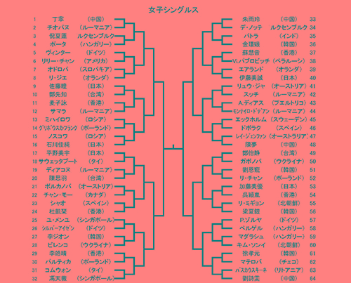 このほか、世界女王・丁寧は勝ち進むと3回戦でカット主戦型のリ・ジエ(オランダ)と対戦することが予想される。大会前の練習では入念にカット打ちをしており、3回戦が1つのヤマになるだろう。悲願の初優勝を狙う劉詩雯は徐孝元(韓国)やキム・ソンイ(朝鮮民主主義人民共和国)といったカット選手がそろうブロックに入った。また、中国選手で唯一予選からの出場となった木子は、鄭怡静(中華台北)のブロックに入った。
