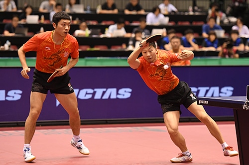 第2ゲーム、先制点を奪ったことで中国ペアはプレーに余裕が出てくる。許昕がフォアサイドに飛びついてフォアハンドドライブを決めるなど、フットワークの良さも見せて中国ペアが大きくリード。一方の日本ペアはなんとかしたいところだったが、台上のうまい許昕のレシーブから先手を奪われるケースが続き。このゲームを3-11で落とす。