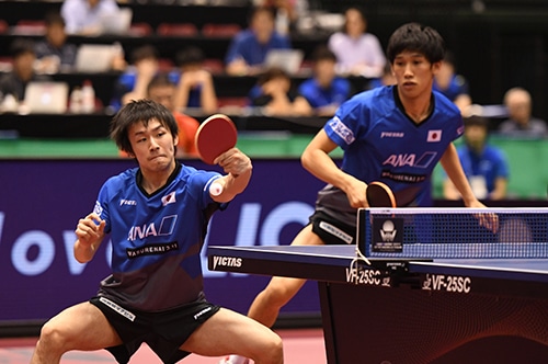 準決勝で森薗/大島との同士打ちを制した丹羽/吉村は決勝で馬龍/許昕と対戦。試合の重要なカギを握る第1ゲームは序盤から点差の離れない緊迫した展開が続く。その中で日本ペアは吉村が馬龍の強烈なフォアハンドをカウンタードライブで返すなど、厳しいプレーで9-7でリードして終盤を迎える。しかし、ここから吉村のサービスに対して許昕がレシーブから強打するなど厳しいプレーで中国ペアが追いつく。9-9からのラリーでは丹羽のチキータに対して馬龍がバックハンドで反応し、得点。続くラリーでも丹羽のチキータからの展開で得点を狙った日本ペアだが吉村のドライブが外れて9-11でゲームを先制された。