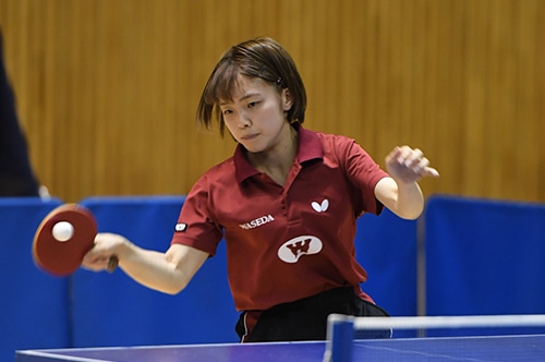 女子は、早稲田大学と日本体育大学の対戦。トップは阿部と谷岡のエース対決。抜群のカット打ちを見せる阿部に対して谷岡は攻撃と多彩なカット技術で粘る。一進一退の攻防は、阿部が競り合いを制した。続く鎌田は前瀧美音と接戦。フォアサイドへの攻めが勝負ところで光り鎌田が逆転勝利。地元北海道で貴重な勝利を果たした。ダブルスは落としたが4番で徳永が会心のプレーを見せて優勝を決め昨年に続き連覇を達成した。