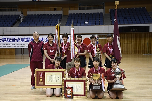 専修大学は惜しくも優勝はならず女子は、早稲田大学と日本体育大学の対戦。トップは阿部と谷岡のエース対決。抜群のカット打ちを見せる阿部に対して谷岡は攻撃と多彩なカット技術で粘る。一進一退の攻防は、阿部が競り合いを制した。続く鎌田は前瀧美音と接戦。フォアサイドへの攻めが勝負ところで光り鎌田が逆転勝利。地元北海道で貴重な勝利を果たした。ダブルスは落としたが4番で徳永が会心のプレーを見せて優勝を決め昨年に続き連覇を達成した。