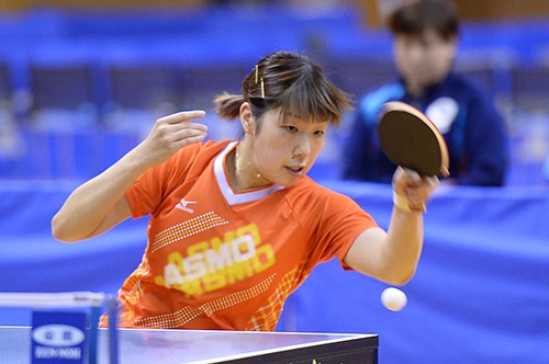2対2のラストではアスモ・小道野とサンリツ・天野が対戦。第1ゲームを先制された小道野だが、第2ゲーム以降はブロックで天野のオープンになったスペースを的確に突くなど、ゲームを優位に進めた。ゲームカウント2対2で迎えた最終ゲームは、緩急をつけたドライブで天野のミスを誘うなど、安定した両ハンド攻撃を見せて11-9で勝利。アスモに大会初優勝をもたらした。