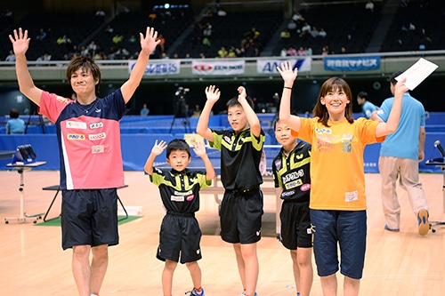 優勝後、スタンドの歓声に応える田阪卓研男子団体は、田阪卓研が嬉しい初優勝。スーパー小学4年生の松島輝空が確実に2点を取り、高橋と松島輝空の弟・翔空が1点をもぎ取るオーダーで優勝へと駆け上がった。次々に年上の強豪選手を圧倒する松島輝空の強さもさることながら、プレッシャーのかかる場面で勝ち星を挙げたペンドライブ型の高橋の活躍も光った。
