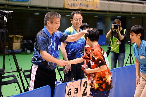 決勝の4番で優勝を決めた小塩をねぎらう石田監督女子団体は第29回大会以来、6年ぶりに石田卓球クラブ(福岡)が制した。ホープス優勝のカット主戦型・小塩が変化と安定性に富んだカットで相手を寄せ付けずに全勝。田原と首藤のサウスポー二人も、パンチの利いた攻撃で勝ち星を積み重ね、危なげなく優勝へと突き進んだ。