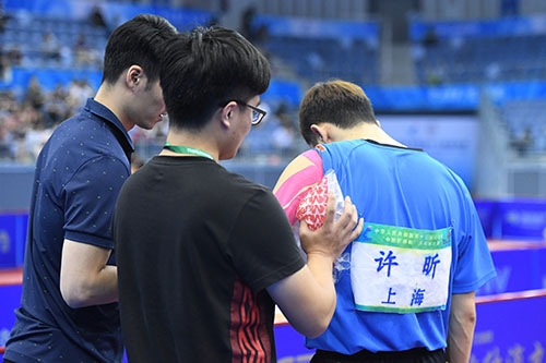 1時間20分を越える熱戦となった許昕対郝帥は、左肩に故障を抱えていた許昕が疲労もたまりいよいよプレーに支障をきたすレベルになってきた。2対2のゲーム間に許昕は治療タイムを取り、上海チームのドクターが左腰のマッサージ、テーピングを行い、許昕はようやくコートに戻った。フォアハンドを大きく振れない許昕は裏面バックハンドと、コンパクトに振るフォアハンドカウンターで、やはり連戦の疲労が見える郝帥を押し切った。翌日には男子ダブルスもあるだけにけがの様子が心配される。