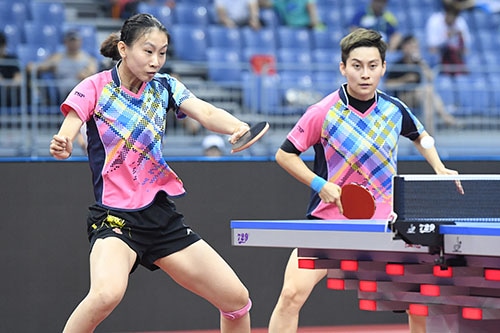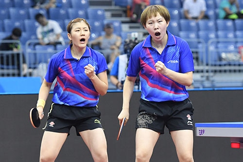 世界卓球2位の朱雨玲/陳夢に対して、ワイドに攻められるサウスポーの劉高陽とフォアハンドの一発の威力のある馮亜蘭が、2対1とリード。第4ゲームからラリー志向に変更した朱雨玲/陳夢が大きなラリーで得点して流れをつかみ、劉高陽にチャンスメークをさせずに、ミスの少ない両者の持ち味が生きる展開に。後半は朱雨玲/陳夢は左右のペアをクロスさせる巧みなコース取りで得点を重ね、3ゲーム連取。中国代表の意地を見せた。