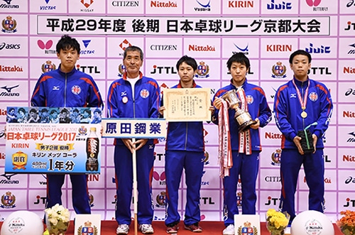原田鋼業は8試合のうち、落としたゲームはわずかに2と圧倒的な強さで1部復帰を決めた。優勝に向けて是が非でも勝ちたい日野自動車戦は、エースの横山がゲームオールジュースの末に村井を破ると、2対1で迎えた4番ではルーキーの徳島が決勝点を挙げた。原田鋼業は最終戦でJR北海道にストレートで勝利して全勝優勝を達成。チームの主軸として活躍した徳島は最高殊勲選手賞、優秀ペア賞、新人賞を獲得した。