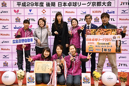 広島日野自動車は8試合のうち3試合が5番までもつれたが、いずれも接戦を制して全勝優勝を果たした。優勝がかかった愛媛銀行戦はトップで丹羽が藤井を破って先制点をもたらすと、2番の馬文婷も続いて優勝に王手をかけた。3番のダブルスは落としたが、4番の市原が接戦の末に勝利して1部昇格を決めた。なお、最高殊勲選手賞にはシングルス6戦全勝の丹羽が選ばれた。