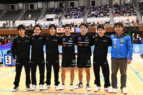 協和発酵キリンが東京アートとの優勝をかけた最終戦にストレートで勝利して2期ぶり14回目の優勝を達成した。協和発酵キリンは最終戦を前にシチズン時計に敗れ、最終戦に臨んだ。一方の東京アートは全勝で最終戦を迎えた。協和発酵キリンは1番で上田が質の高い厳しいプレーで高木和とのラリー戦に勝利。これで勢いに乗ると、2番の平野も張にストレート勝ち。3番の松平/上田のダブルスは第1ゲームを奪うと、第2ゲームでリードをされていたものの逆転勝利。この結果、協和発酵キリンと東京アートが6勝1敗で並んだが、得失差で協和発酵キリンが東京アートを上回り、逆転優勝を果たした。