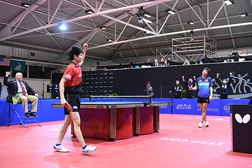 3番はフランス戦で手痛い黒星を喫した髙見がメンタルを立て直して準決勝に臨み、台上レシーブで先手を取る展開で優位に。2ゲーム目以降の競り合いも確実に物にして日本が決勝進出に王手。