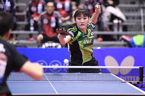 3番の長﨑は、昨年の世界ジュニア女王に対して、一歩も引かない強気のプレーで第1ゲームを奪取。パワフルな両ハンドドライブとチキータで得点を重ね、2ゲーム目も連取。ラリー戦では攻め込まれたときの守備力、カウンター力も光った。第3ゲームは序盤でリードしながらも相手に連続得点を与えて逆転を許す。しかし、仕切り直した第4ゲームは再び長﨑が両ハンドで石洵瑶を圧倒。日本は貴重な1点目を挙げた。