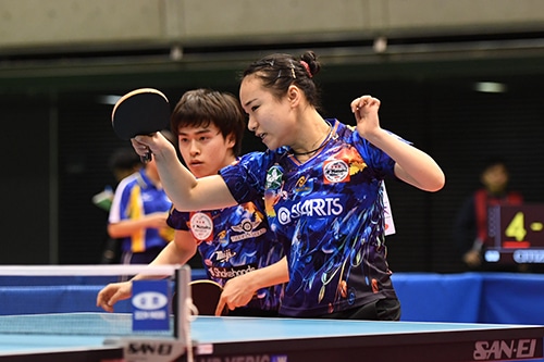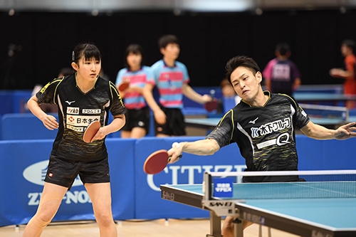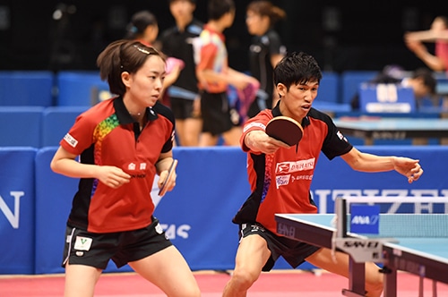 張本/平野は二木/後藤(駒澤大/中央大)と対戦。第1、第2ゲームはフォアサイドへの攻めに対して体勢を崩される場面もあったが、勝負どころではレシーブからチキータで積極的に攻めてゲームを連取。これでリズムをつかんだか第3ゲームは序盤からリードを広げてストレート勝ちを収めた。試合後、張本は「初戦でミスが出ましたが、徐々に良くなりました。平野選手のサービスが良くて、僕が何もしなくても点が入るような展開でした。次も良い試合がしたいです」と話した。また、平野は「初戦だったので1ゲーム目は緊張しましたが良いプレーができました。最後になるに連れていい試合ができました。張本選手はレシーブから質が高くてあらためてすごいと思いました。向かっていく立場で頑張りたいです」と語った。
