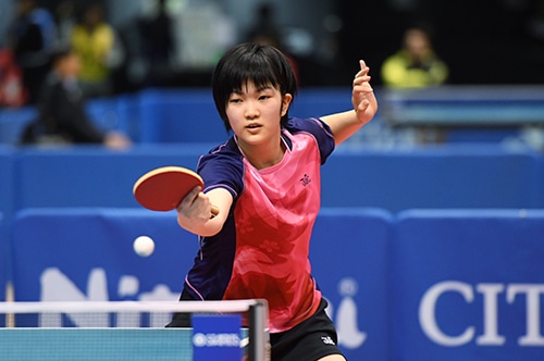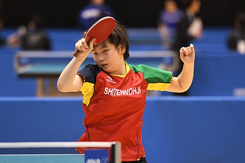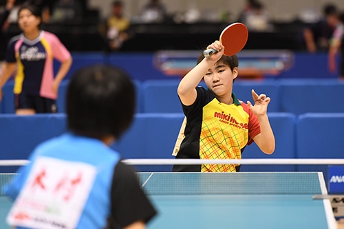 木原は坂本詩織(富田高)と対戦。1ゲームを先取して迎えた第2ゲームは木原の表ラバーでのピッチの速いバックハンドにもしっかりと対応する坂本に苦戦。ラリーで先にミスが出る場面が目立つなどジュースにもつれたが、最後は安定感で勝ってゲームを連取。続く第3ゲームも前陣でリスクを背負って攻める坂本に苦戦するも、中盤以降に抜け出してストレート勝ちを収めた。