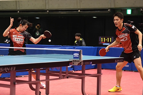 森薗/伊藤は及川/安藤(専修大)と対戦。4回戦で前年度王者の田添/前田(専修大/日本生命)を破った森薗/伊藤はこの試合でも圧巻のプレーで学生ペアをリード。台に近い位置取りで戦い、相手ペアを押し込み、ストレート勝ちでベスト4入りを決めた。及川/安藤はここまで連係の良さが光ったが、森薗/伊藤を破るには至らず、惜しくも4強入りを逃した。試合後、森薗/伊藤は「安藤選手が表ラバーを使っていて、対応が難しいので試合前にしっかりと確認しました。僕の出足が悪くて競り合うかと思いましたが、美誠が良くて勝つことができました。(森薗)」「4回戦で前回王者のペアに3対0で勝てたことが自信になりました。準々決勝の及川/安藤ペアには苦手意識があり、負けたくないと思っていました」と語った。