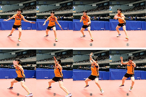 連続写真1~8は、塩見戦の最終ゲームで見せた中陣でのフォアハンドドライブだ。フォア側に来たボールに対して、打ち損じないようにボールをしっかり引きつけてから打球している(写真4)。スイング後、左足のつま先を前に向けて体のバランスを保っている点も、フォア側に動いてフォアハンドドライブするケースで参考にしてほしいポイントだ(写真7)。