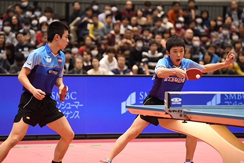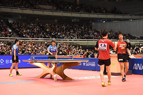 水谷/大島は宇田/張本と対戦。シングルスの実力者たちがそろったこの試合では水谷/大島がゲームを先制。台上プレー、ラリー戦で試合を優位に運んだ。続く第2ゲームも流れは変わらず、水谷/大島が若手ペアを封じてゲームを連取。第3ゲームは宇田/張本がゲームを返したが、第4ゲームを締めた水谷/大島が勝利。強力ペアが決勝の舞台へと勝ち進んだ。