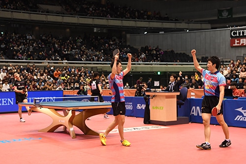 男子ダブルス決勝は水谷/大島(木下グループ)が上田/吉田(協和発酵キリン)をゲームカウント3対1で破り、初優勝を果たした。