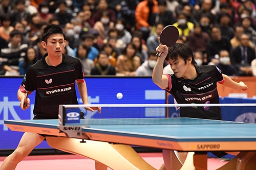 1対1で迎えた第3ゲームも接戦が展開される。少しでも甘いボールを返球すると、攻撃される中で、台上での厳しいせめぎ合いが続けられた。しかし、9-9の場面でストップ対ストップの展開から協和発酵キリンペアのストップが大きく浮いたところを水谷が強打。甘いボールを見逃さずに得点してゲームポイントを握ると、続くラリーも制して優勝に王手をかけた。