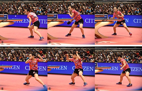 連続写真1~6は、第5ゲームで勝利を決めた回り込みフォアハンドスマッシュだ。バック側に来たボールに対して、左足をバック側に運びながら体を小さくまとめるようにバックスイングすると(写真1~3)、ラケットを水平気味に振り抜き、フォアハンドでスマッシュした(写真4~6)。この連続写真のように、裏ソフトラバーでありながら、チャンスがあれば積極的にスマッシュを使えることが、伊藤の大きな強みだ。