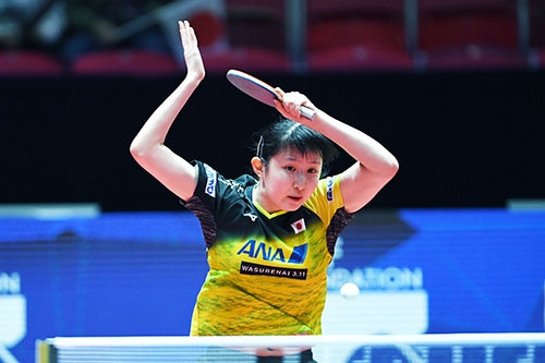 2番は、初出場の早田。アフリカ大陸ナンバーワン・メシュレフとのサウスポー同士の対戦は、バック対バックからミドルを突かれてなかなか先手を取らせてもらえない展開が続いたが、要所で厳しいフォア攻めと果敢な回り込みで得点し、ストレートで難敵を退けた。