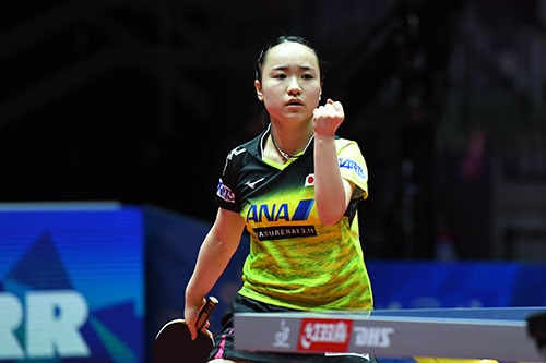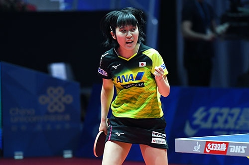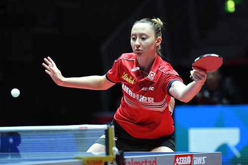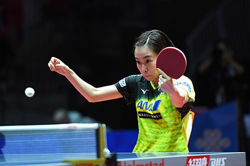トップを任されたのは伊藤で、4試合連続の先発。相手は世界ランキング21位のポルカノバ。長身のサウスポーで、サービスとバックハンドがうまい選手だ。第1ゲームは、伊藤がポルカノバの逆横回転サービスと広角に打ち分けてくるバックハンドドライブに手こずり、ジュースにもつれる。13−12とリードしたところで伊藤がタイムアウト。タイムアウト後、ポルカノバの逆横回転サービスを思い切ったフォアハンドドライブでストレートに抜き去って第1ゲームを先制する。続く第2、第3ゲームも得意の表ソフトからのバックループからの速攻で攻め立て、ストレートで押し切った。