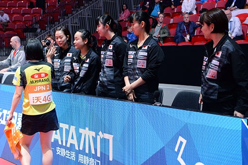3番の平野が対するのは、バック面アンチラバー、フォア面に表ソフトラバーという極めて特殊なスタイルのA.ゾルヤだ。アンチラバーの性質は粒高ラバーと似ているが、より重い球質になる特徴がある。しかも、前陣でアンチラバーを使ってくるため、はまると厄介な相手だ。平野もはじめはA.ゾルヤの前陣で繰り出す下回転のボールにネットミスしていたが、「カット打ちだと思って」というベンチのアドバイスで徐々に対応し、ストレート勝ち。日本の勝利を決めた。