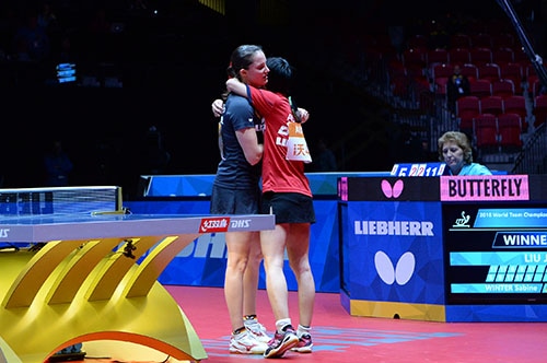 4番はオーストリアがポルカノバ、ドイツはエース・P.ゾルヤ。実績に勝るP.ゾルヤがやや有利かと思われた試合は、予想通りP.ゾルヤがミスの少ない両ハンド攻守で2ゲームを連取し、勝利に王手をかける。しかし、ここからポルカノバが奮起。安定志向のP.ゾルヤに対し、台上での積極的なバックハンドフリックや長いリーチを生かした両ハンドが決まるようになって3ゲームを連取し、逆転勝利。ラストに望みを託した。