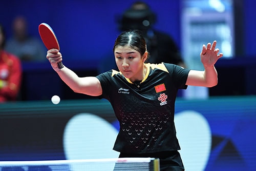 2番は陳夢とアンチ使いのA.ゾルヤ。陳夢はつなぎのふわっとしたバックハンドをつまく使ってA.ゾルヤのアンチラバーの変化を半減させ、甘くなったところを強打で仕留める好球必打の戦術で完勝し、早々に中国が王手。
