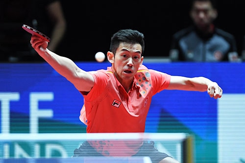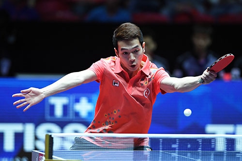 2番の水谷は何鈞傑と対戦。グループリーグを通して何鈞傑の調子は芳しくなかったが、この試合は格上の水谷が相手ということで思い切ったプレーに徹してきた。水谷は何鈞傑の強引とも思えるバックハンドに手を焼き、第1ゲームを先行されると、続く第2ゲームもジュースまでもつれ込む。さすがに2ゲームを先行されると苦しい水谷は、相手の猛攻をなんとかしのいでタイに戻すと、続く第3ゲームを競り勝つ。リードして力が抜けた水谷はストレートへのバックハンドドライブが面白いように決まり、第4ゲームは何鈞傑を圧倒して日本に2点目をもたらした。