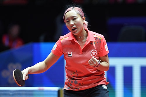 いつもは相手があきらめてしまうほど粘り強いプレーをする丁寧が簡単なミスを連発し、ボールを追えない。一方、蘇慧音は前陣で両ハンド強打をビシバシと打ち込む。その結果、まったくいいところなく、トップで世界チャンピオンの丁寧が蘇慧音にストレートで敗れるという、まさかの展開で中国対香港がスタートした。
