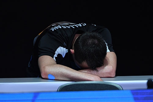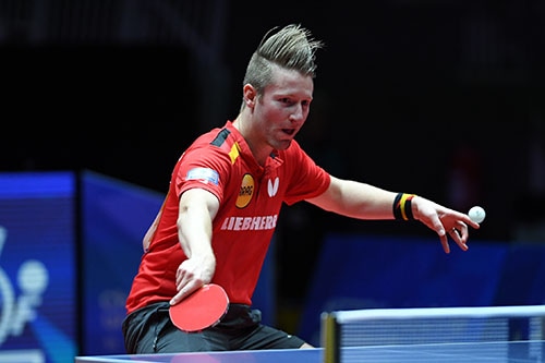 1番はカルデラーノがシュテーガーを、持ち前のぶっとい弧線を描く両ハンドパワードライブで下して先制点。しかし、あとが続かなかった。2番でヨウチがフィルスに敗れ、3番でツボイがオフチャロフに敗れ、ドイツが王手をかける。