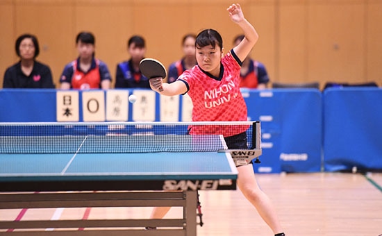 神戸松蔭女子学院大は準々決勝で愛知工業大に競り勝ってベスト4入り。全員で3点を取るスタイルの団体戦に強いチームだ。日本大は2回戦で東京富士大、準々決勝で大正大と5番までもつれる接戦を連破してベスト4入り。3年生の奥下がポイントゲッターとして単複で活躍した。
