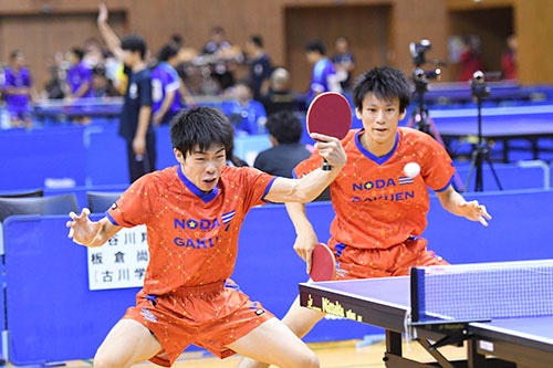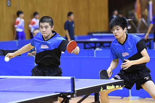 男子ダブルスは、第1シードの田中/加山(愛工大名電)が危なげなく4回戦進出。田中の精度の高いブロック&カウンターと加山のパワーボールのマッチングは強力だ。