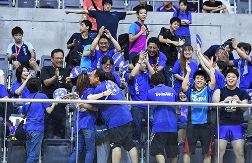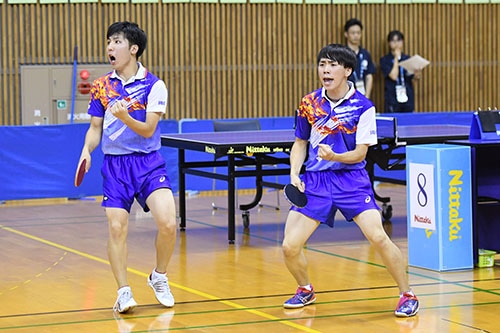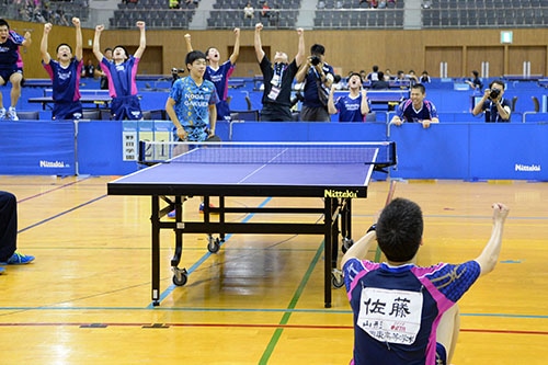 勝負を決したのは、2台進行で実質のラストになった4番の佐藤対宮川。実績、実力では宮川が上かと思われたが、宮川は気負いすぎての打ちミスが目立つ。一方の佐藤は、ブロックや好機での攻めなどできることに徹し、試合はゲームオールまでもつれ込んだ。10-9佐藤リードで、硬さの取れない宮川のバックハンドドライブがオーバーすると、佐藤は歓喜で床に倒れ込んだ。