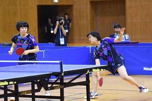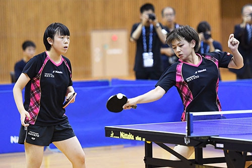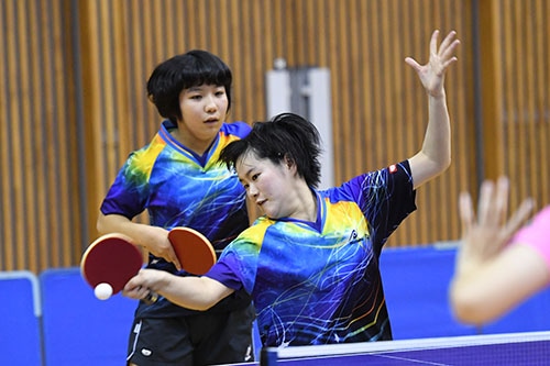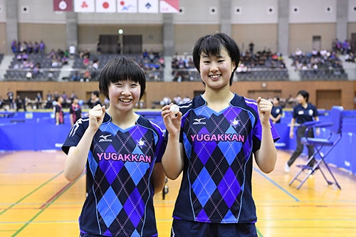 女子ダブルスを制したのは左シェーク攻撃型の出雲と、カット主戦型・相馬の遊学館ペア。序盤こそ、お互いの位置取りや得点パターンが定まっていないようなプレーが見受けられたが、ペースをつかんでからは相馬のカット+攻撃と出雲のブロック&カウンターのタイミングがびったしはまり、危なげないプレーで驀進。遊学館にうれしい全国初のタイトルをもたらした。