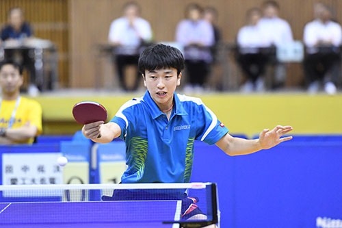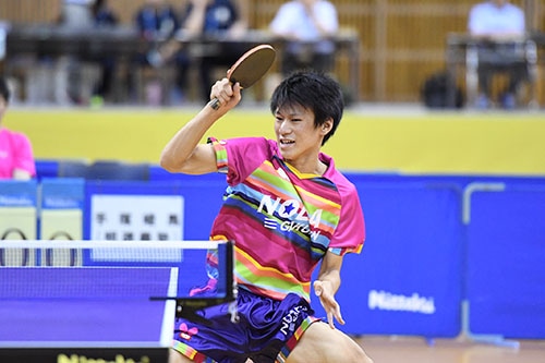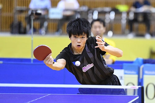 男子シングルス準決勝が行われ、戸上(野田学園)と田中(愛工大名電)が決勝に勝ち進んだ。
